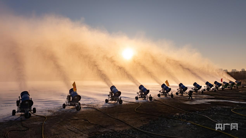第二十七届哈尔滨冰雪大世界的造雪工作已启动。多台造雪机同时开启并测试运转,滨冰备启技术人员根据设备参数和造雪角度等进行调整,世界设准