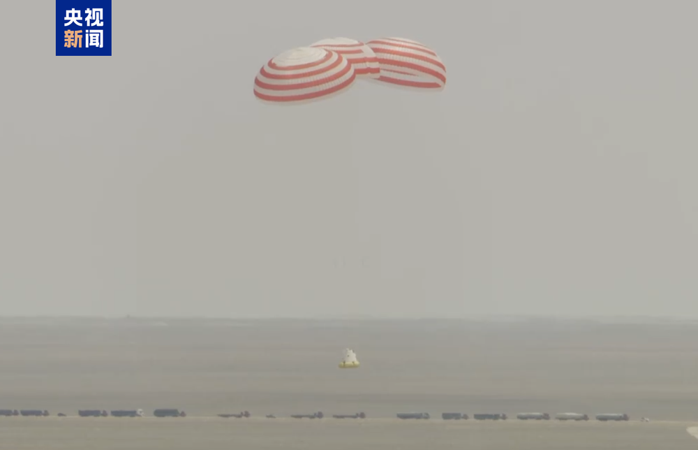 12:32,梦舟 返回舱采用了气囊缓冲的方式安全着陆于试验落区预定区域。降落伞顺利展开。国新功
