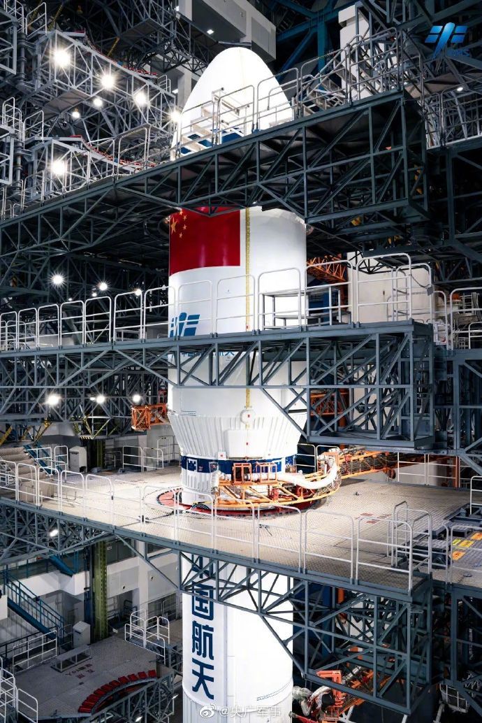天舟六号货运飞船与长征七号遥七运载火箭组合体被垂直转运至发射区。天舟
