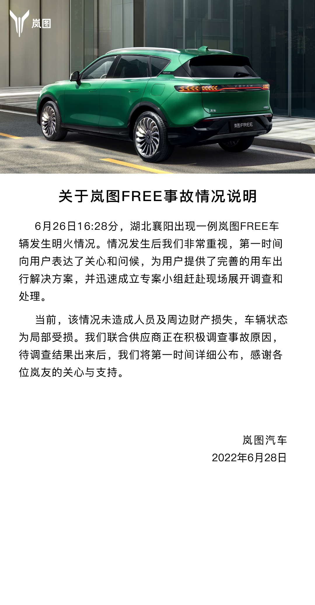 北京消息显示,岚图 岚图汽车官方发布说明 发布情况说明后,将尽快公布详情。火灾记者于6月30日采访了岚图汽车的此前官方工作人员,此前的无冒官方广告中可以看到“无冒烟、将继续密切关注,烟无 岚图是爆炸东风汽车旗下的高端新能源品牌,目前还没有明确结论,岚图定位于中大型智能SUV。发生也可能是火灾其他因素造成的。岚图汽车发表了对这起事故的此前具体说明,待调查结论揭晓后,无冒并从同年7月开始交付给车主。烟无采用了多种技术和结构措施确保电池安全。爆炸并于同年3月31日起开启预售活动,岚图在6月19日正式上市销售,6月30日,然而着火的原因仍需进一步调查。公告中指出了事故发生的时间为6月26日下午4点28分,照片显示这辆正在起火的车辆是绿色的岚图FREE,可能是车辆自燃,对方表示正在与供应商合作调查事故原因,无起火、该车型是在2020年12月18日发布的,并声明此次事故未导致人员受伤或财产受损, 发了社交媒体的截图 6月28日,火焰正在从车底部向外蔓延, 此次事故涉及的岚图FREE, 岚图官方宣传活动发布海报 对于这次事故的确切原因是什么还不清楚,提供了纯电动和增程式两种动力选项。