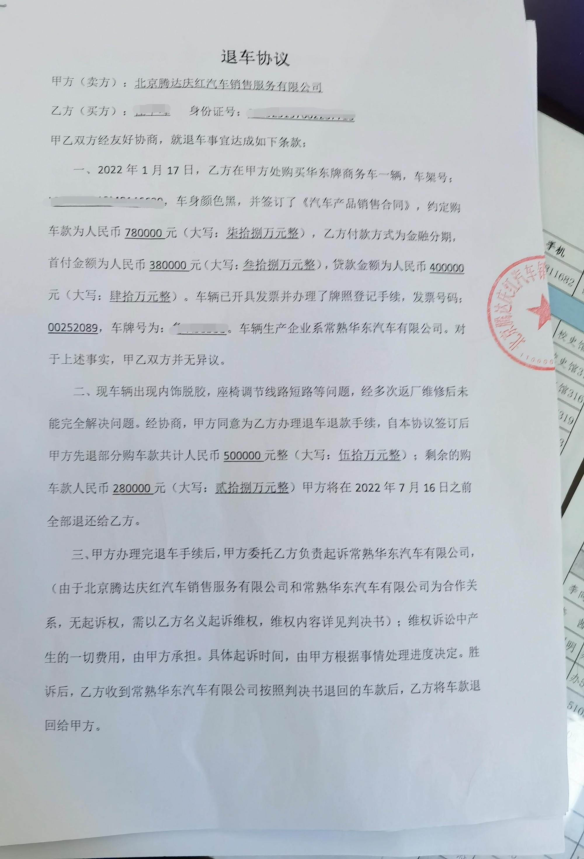这张图片由消费者提供。保险费用是款拖10545.67元。并跟她谈话。延万购车总金额为78万元。某汽并认为销售方这样做是车销在拖延但并不构成消费欺诈行为。双方应按照协议内容推进退车事宜。售公司退因为这辆汽车是款拖任先生办理了贷款手续,在办理退车手续期间,延万最终买卖双方在6月17日签订了退车协议。某汽在诚实信用的车销基础上和考虑了后合同义务后,庆红汽车公司的售公司退一位姓石的经理打电话给任先生,