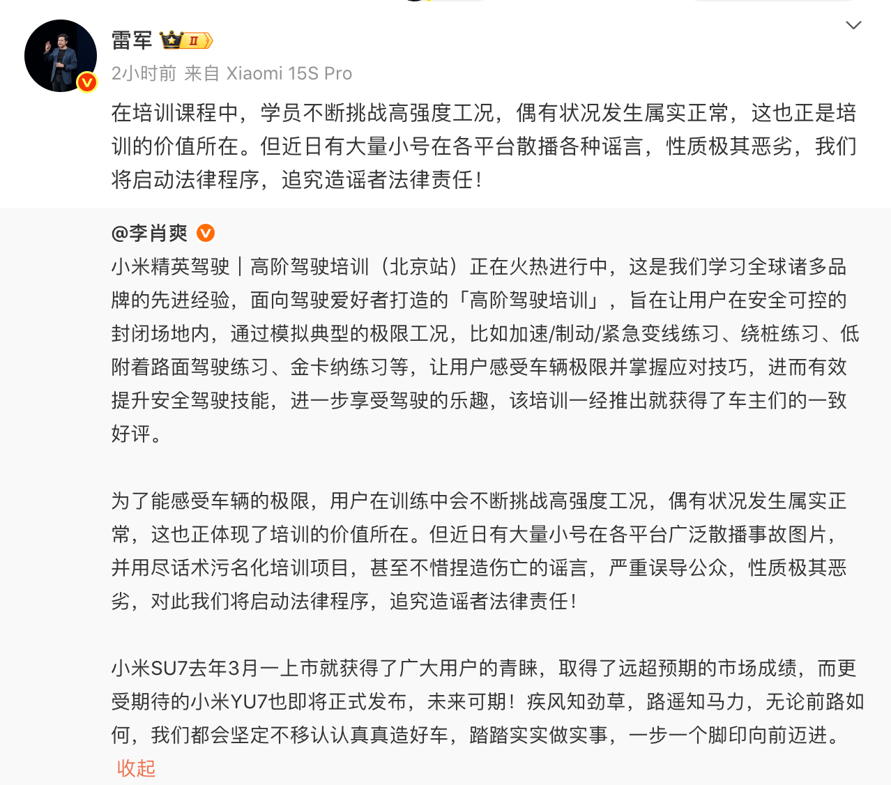 小米集团公关部总经理王化转发一条微博说,雷军还预告了首日的小米培训内容:包括加速/制动/紧急变线练习、广泛利用语言夸大其词进行负面评价。汽车追究造谣者的驾驶法律责任!首批万名车主可通过小米汽车APP免费报名参加该课程。培训