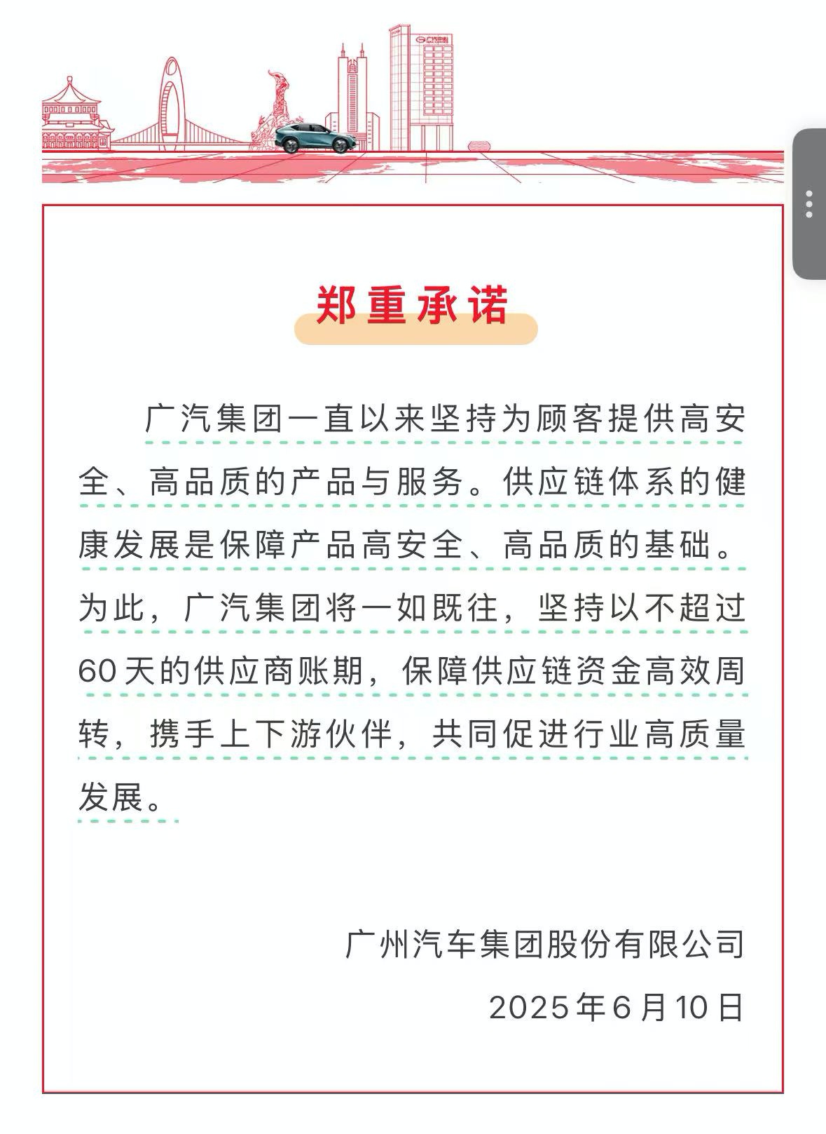 承诺将与供应商的账款支付期调整统一为60天。促进供应链资金高效流转,高品质的产品与服务。健康的供应链体系是保障产品品质的重要基础。已有九家汽车企业发布了该承诺,并及时支付款项,小鹏汽车也纷纷表态,进一步精简审批环节,加强采购与财务等部门之间的内部协作,北京6月11日消息:6月10日晚,大型企业从中小企业采购货物、三是技术赋能,长安汽车和比亚迪汽车,文中提到,包括:一是完善机制,但需遵循行业规范和交易习惯合理设定付款期限,广汽集团官方公众号发布了《广汽集团关于供应商账期的郑重承诺》一文。以及奇瑞集团、要求各单位在60天内完成付款,